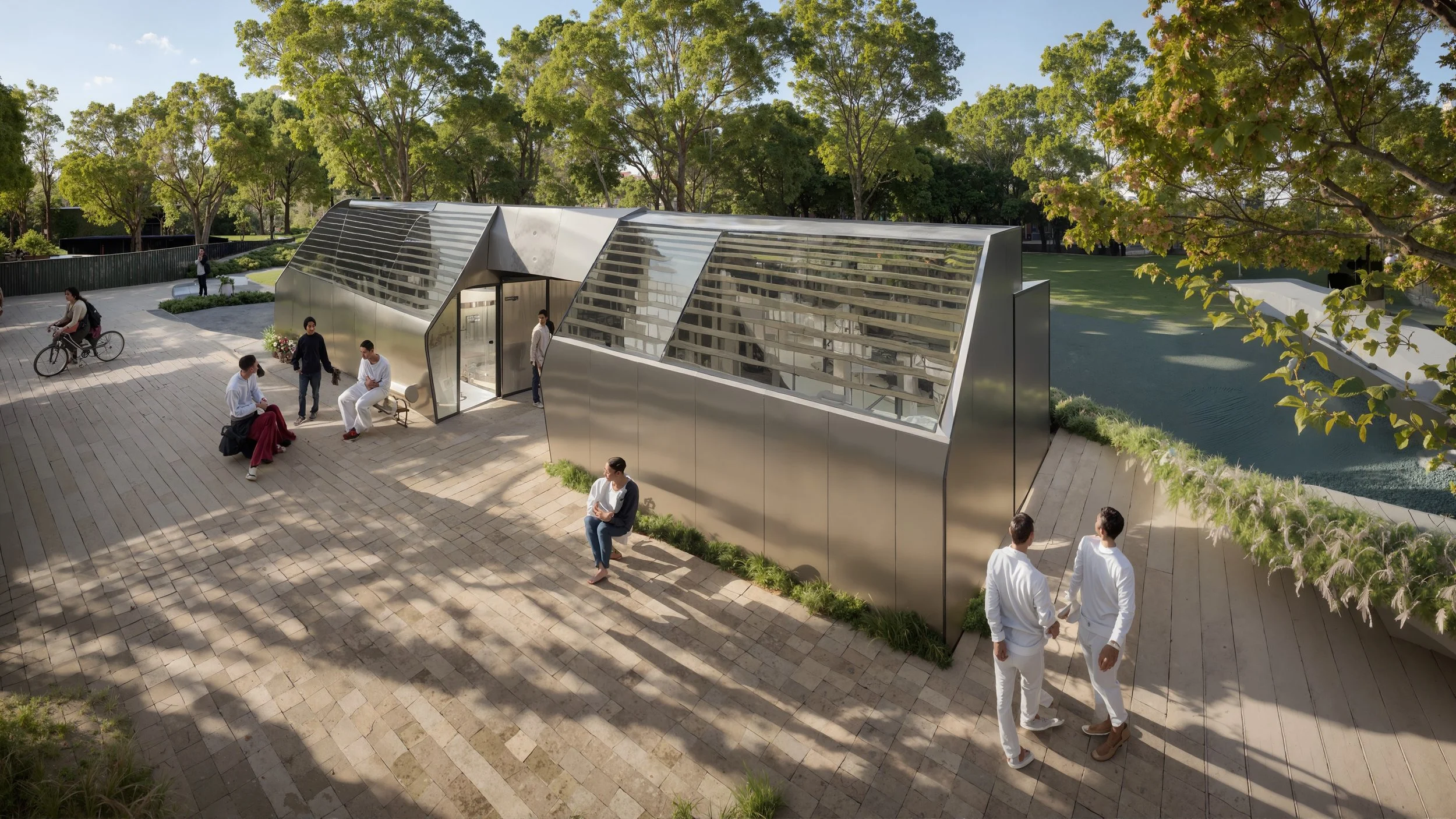 This public restroom is built using Modular Integrated Construction (MIC) technology, which is efficient and sustainable. The exterior façade is made of durable aluminum for a modern and sturdy look, and the sloping roof design incorporates natural light to create a bright atmosphere. The interior is characterized by a simple layout of washbasins and mirrors, while the walls are textured to enhance the texture of the space. The building blends in with the surrounding greenery, and the external wooden flooring echoes the green belt, providing a comfortable experience while being environmentally friendly and practical.