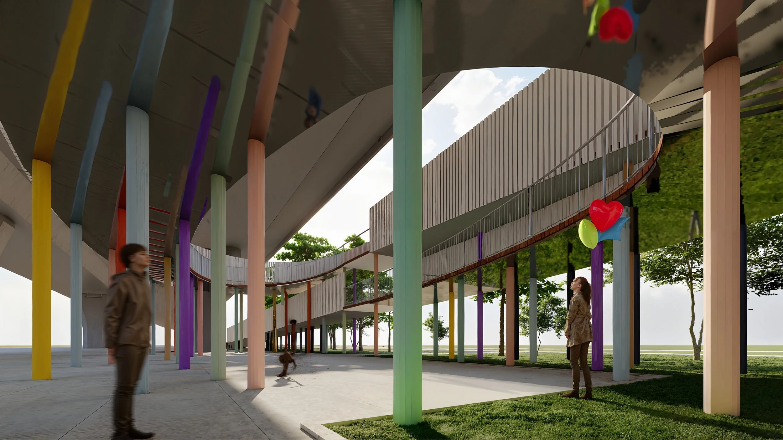The Sensory Passageway integrates elevated ramp walkways and a connecting spiral structure into a site’s northeast greenery, offering visitors a sensory journey. Two wooden boardwalks ascend from ground level, weaving through trees for visual and physical interactions with foliage, while remaining partially exposed to weather under a flyover. The spiral walkway, with slotted panels framing views, shifts visitors between height levels, fostering visual and physical connections, amplified by sounds from wooden planks and mirrored reflections from stainless steel panels. Random, colorful columns at ground level add a dynamic, interactive visual experience.
